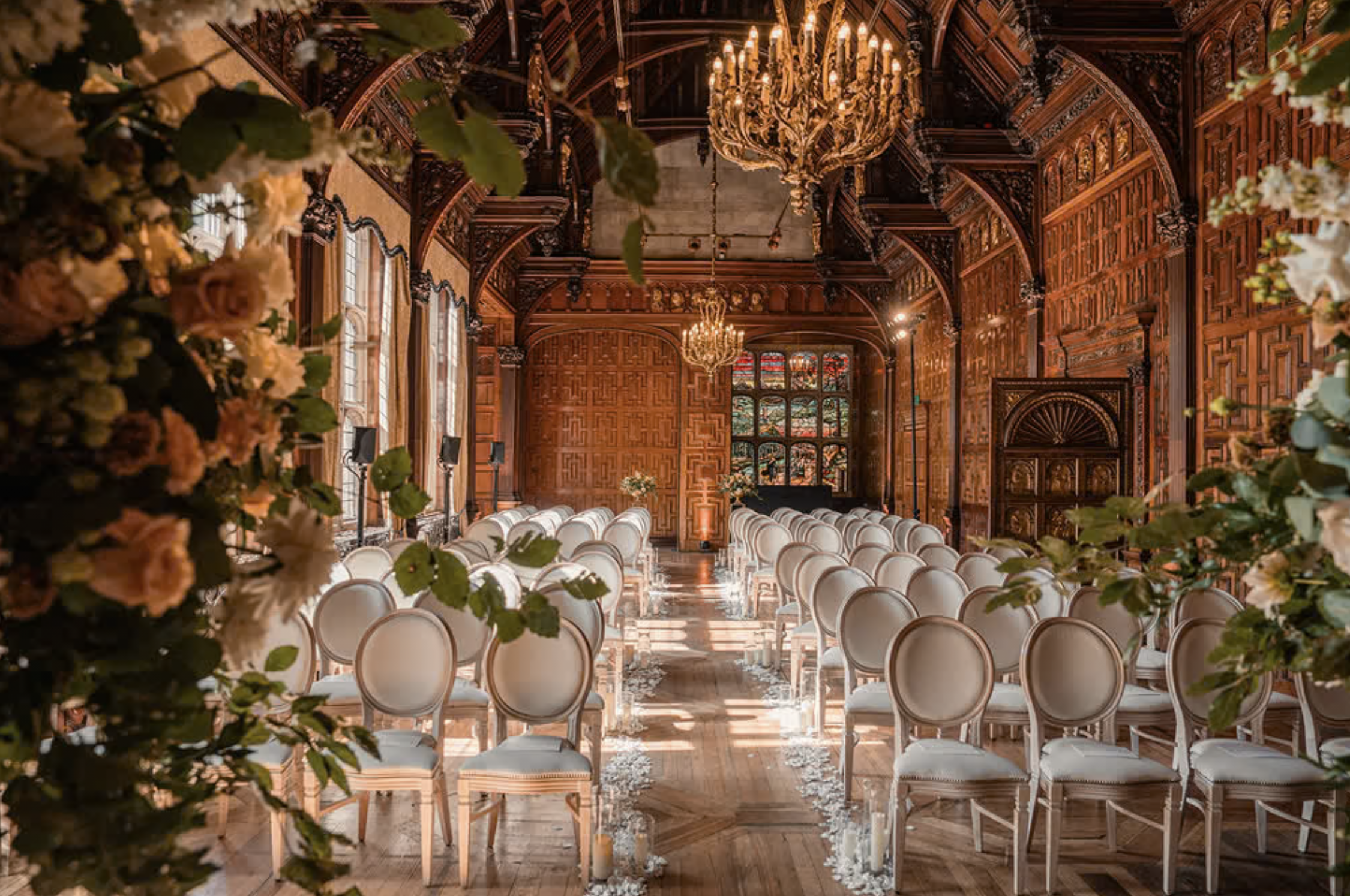 The principal reception space features soaring ceilings, stained glass and intricate timber detailing. It provides a dramatic backdrop for wedding ceremonies and candlelit wedding breakfasts.